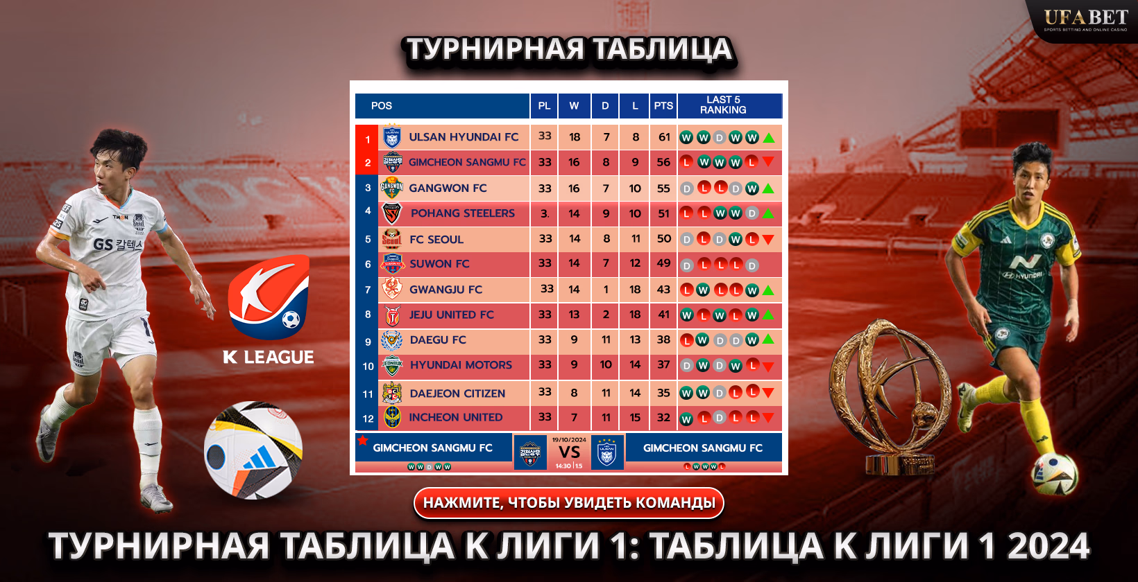 Текущая турнирная таблица K League 1 по сравнению с прошлым сезоном демонстрирует значительные изменения в результатах команд. Ulsan HD (39 очков), Pohang Steelers (38 очков), Gangwon FC (37 очков) и Gimcheon Sangmu (40 очков) входят в число лидеров, подчёркивая высокий уровень конкуренции в лиге. Gangwon FC совершил впечатляющий скачок с нижних позиций на четвёртое место, благодаря победной серии и самой молодой команде в лиге. Gimcheon Sangmu, который сейчас лидирует, значительно улучшил свои результаты после завершения прошлого сезона в нижней половине таблицы. Jeonbuk Motors поднялся с последнего места на четвёртое, что свидетельствует об изменении в уровне их игры.